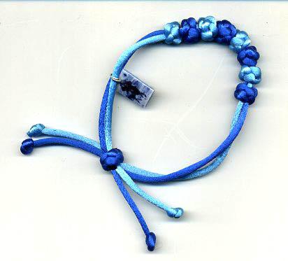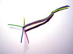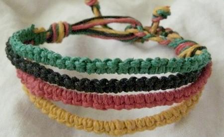 Utilizaremos hilos de lana de 4 colores, rojo, verde, amarillo y azul, cortamos todos de igual longitud y anudaremos, para trabajar con ellos bien tensos los cogeremos a un soporte, en este caso un cojín con un alfiler. Nuestros monitores explican el proceso paso a paso para conseguir pulseras de diferentes diseños.